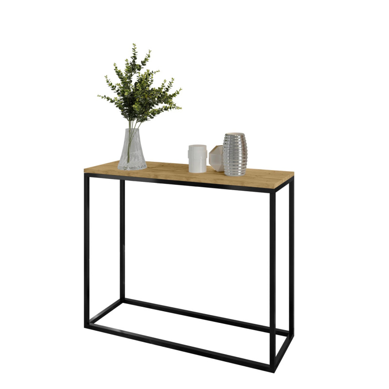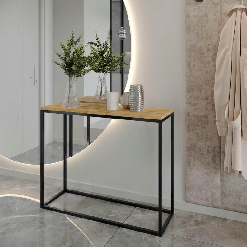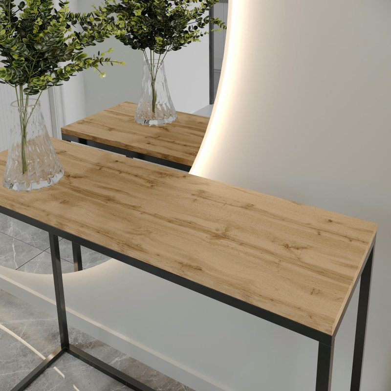 Konsola wyróżnia się niezwykłą prostotą i subtelną elegancją. Czarna stalowa konstrukcja w zestawieniu z blatem w kolorze Dąb Wotan o grubości 18mm tworzy elegancką, minimalistyczną kompozycję. To idealny wybór, jeśli zależy Ci na meblu, który doda charakteru Twojemu wnętrzu.
