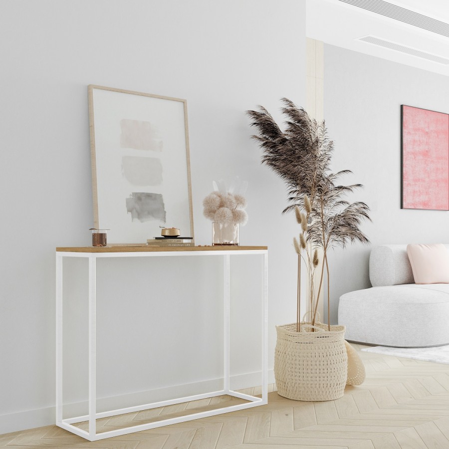 Biały stelaż dodaje konsoli lekkości i nowoczesnego wyglądu, natomiast blat w kolorze dąb wotan wprowadza ciepło i naturalny urok. Ta harmonijna kombinacja kolorów i materiałów doskonale komponuje się w różnych aranżacjach wnętrz, nadając im wyjątkowego charakteru.