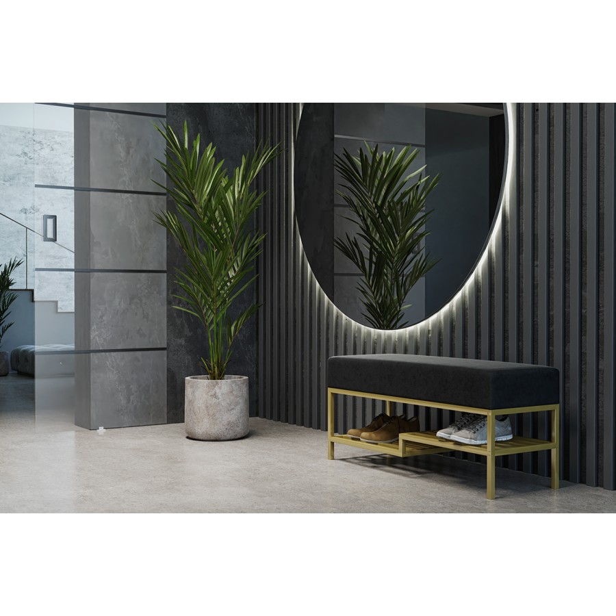 Elegancka ławka tapicerowana czarno-złota z półką na buty, 100 cm. Solidna konstrukcja, komfortowe siedzisko, praktyczna półka. Idealna do przedpokoju, łączy funkcjonalność z elegancją.