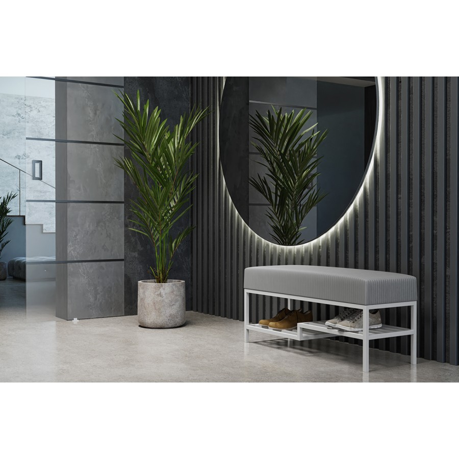 Ta loftowa ławka do przedpokoju to idealne połączenie nowoczesnego designu i funkcjonalności, które sprawdzi się w każdym industrialnym wnętrzu. Wykonana z wysokiej jakości szarego sztruksu, ławka wprowadza do pomieszczenia charakterystyczny klimat, podkreślając surowy urok przestrzeni. Biały stelaż o profilu 2x2 cm, malowany proszkowo, dodaje konstrukcji lekkości, elegancji i sprawia, że mebel idealnie komponuje się z szarym wykończeniem siedziska.