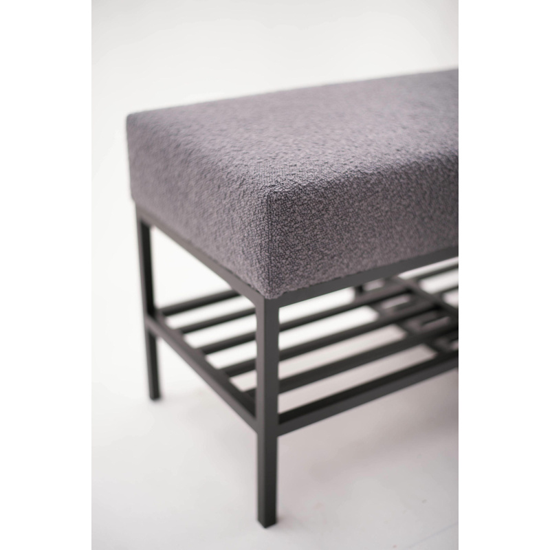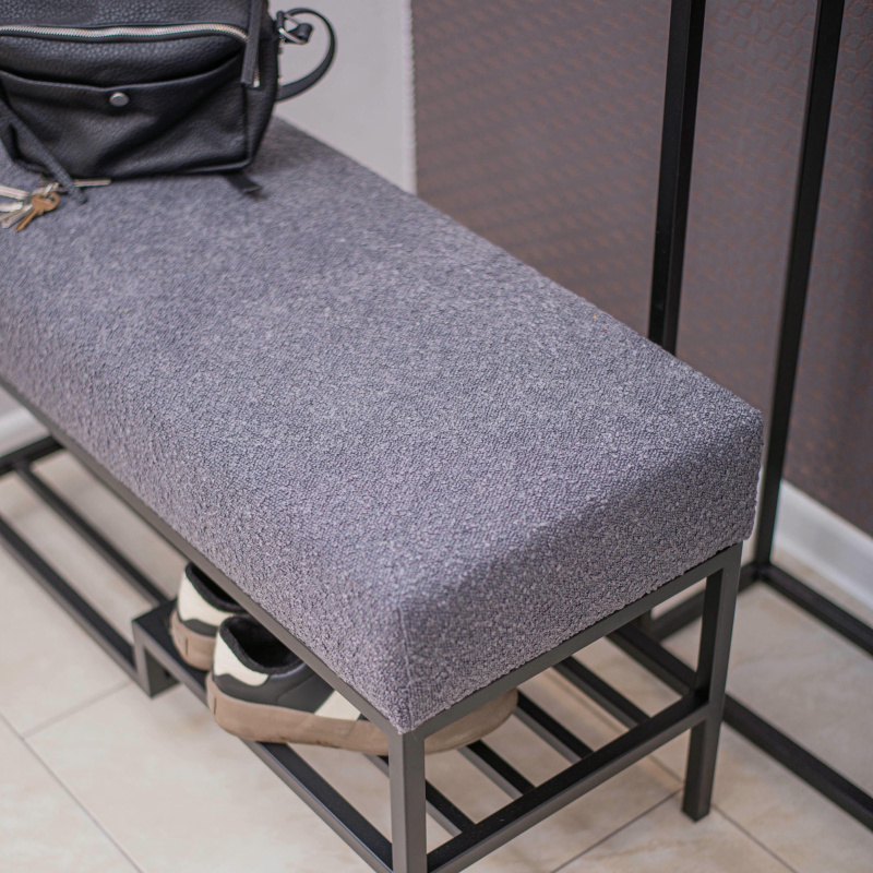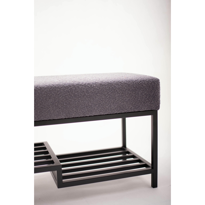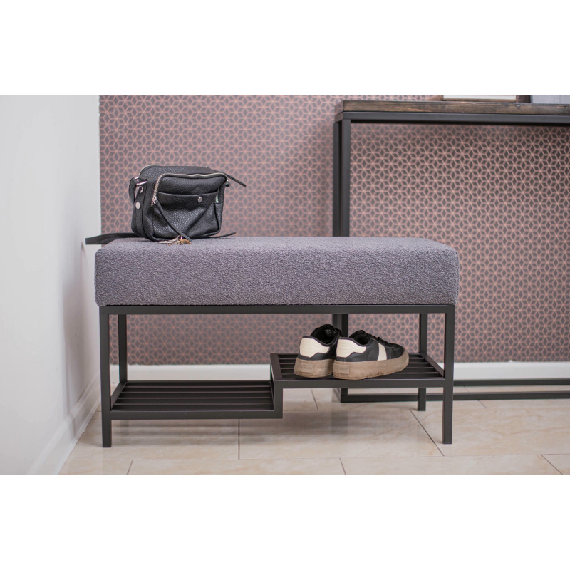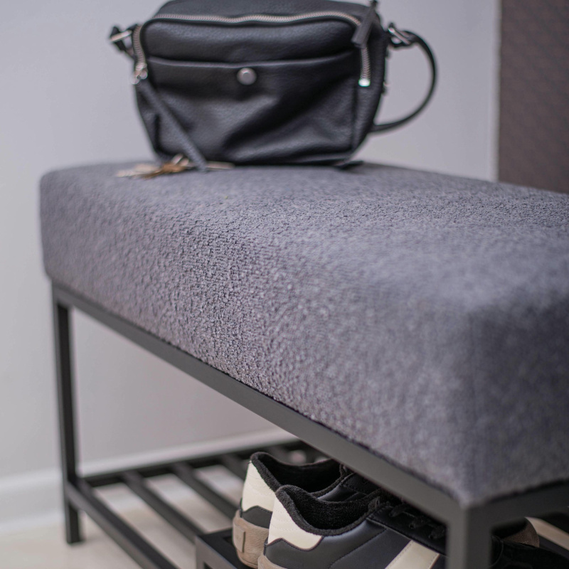 Luksusowa ławka Baloo do przedpokoju w stylu loft. Czarna podstawa, szara tkanina Ballo Boucle i półka na buty. Elegancja, funkcjonalność i trwałość, które odmieniają Twoje wnętrze. .