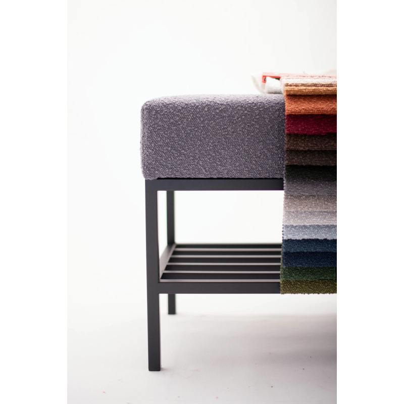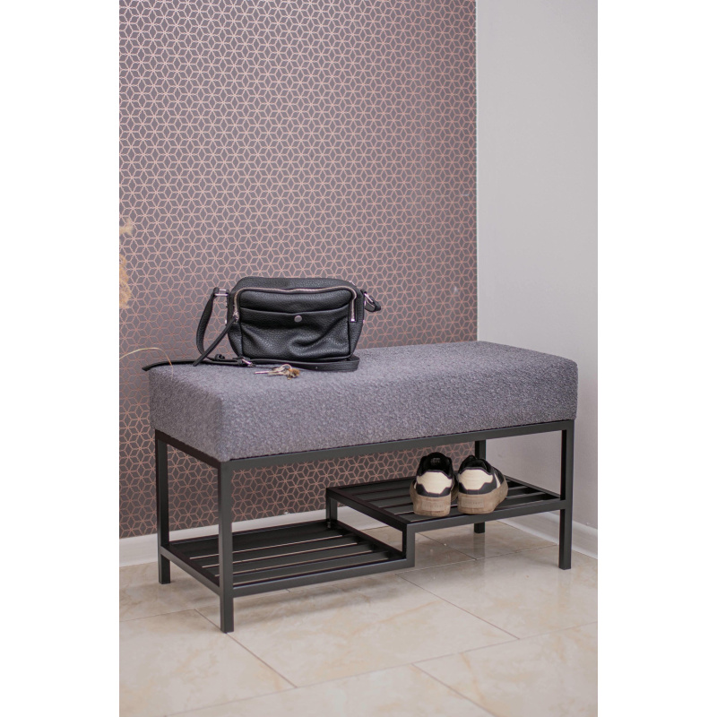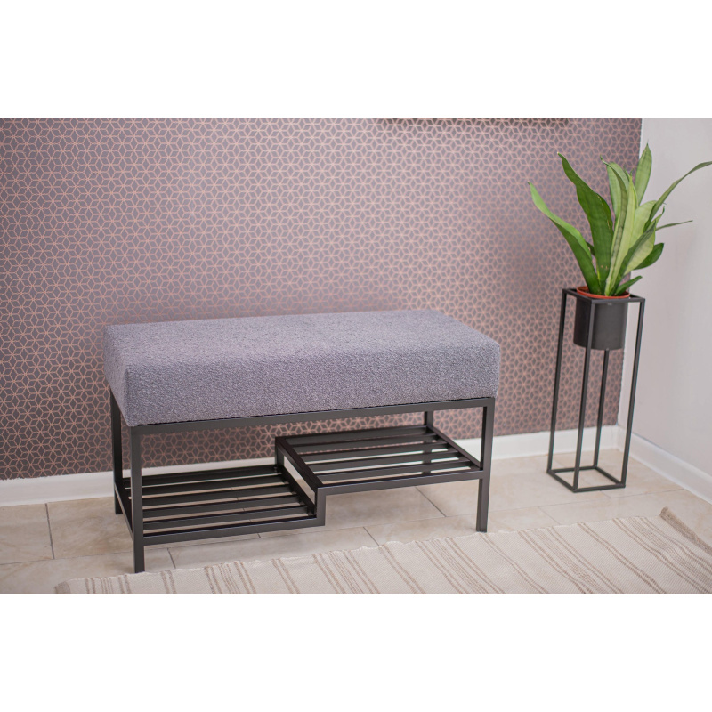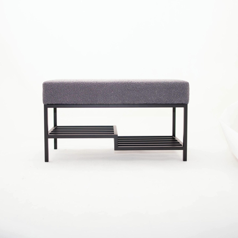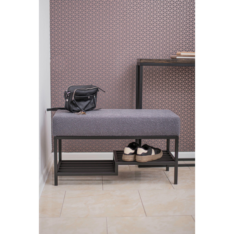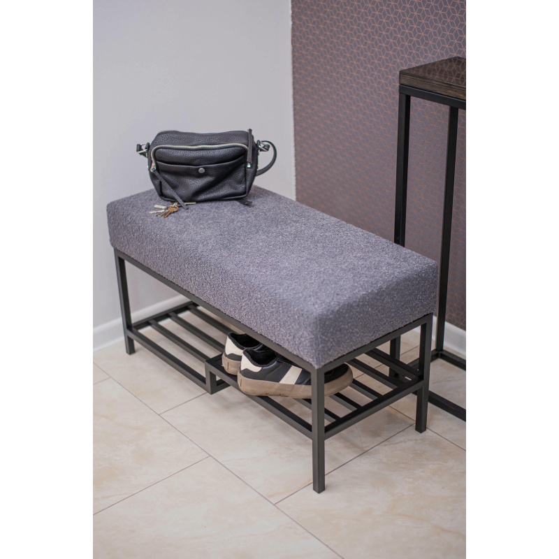Luksusowa ławka Baloo do przedpokoju w stylu loft. Czarna podstawa, szara tkanina Ballo Boucle i półka na buty. Elegancja, funkcjonalność i trwałość, które odmieniają Twoje wnętrze. .