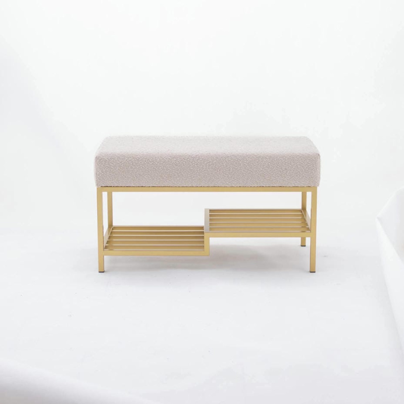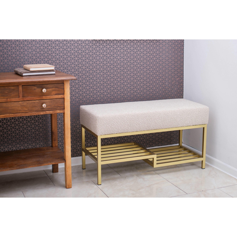 Luksusowa ławka do przedpokoju (100 cm) ze złotą podstawą. Beżowe siedzisko z miękkiej tkaniny boucle, półka na buty i solidna konstrukcja. Styl loft, elegancja i funkcjonalność w jednym!. .