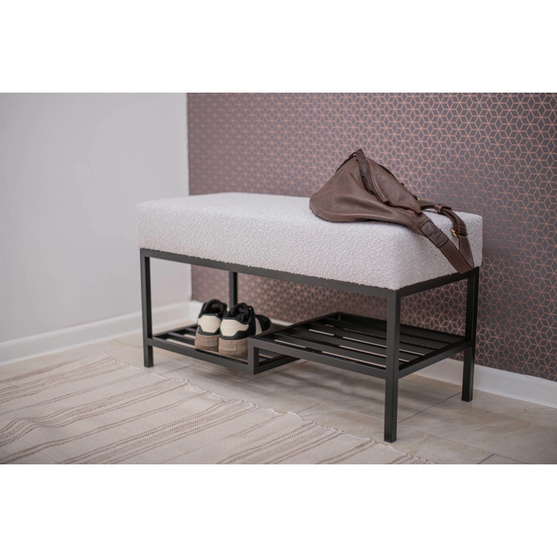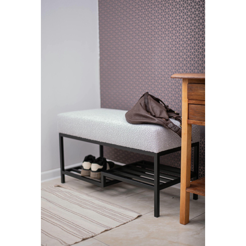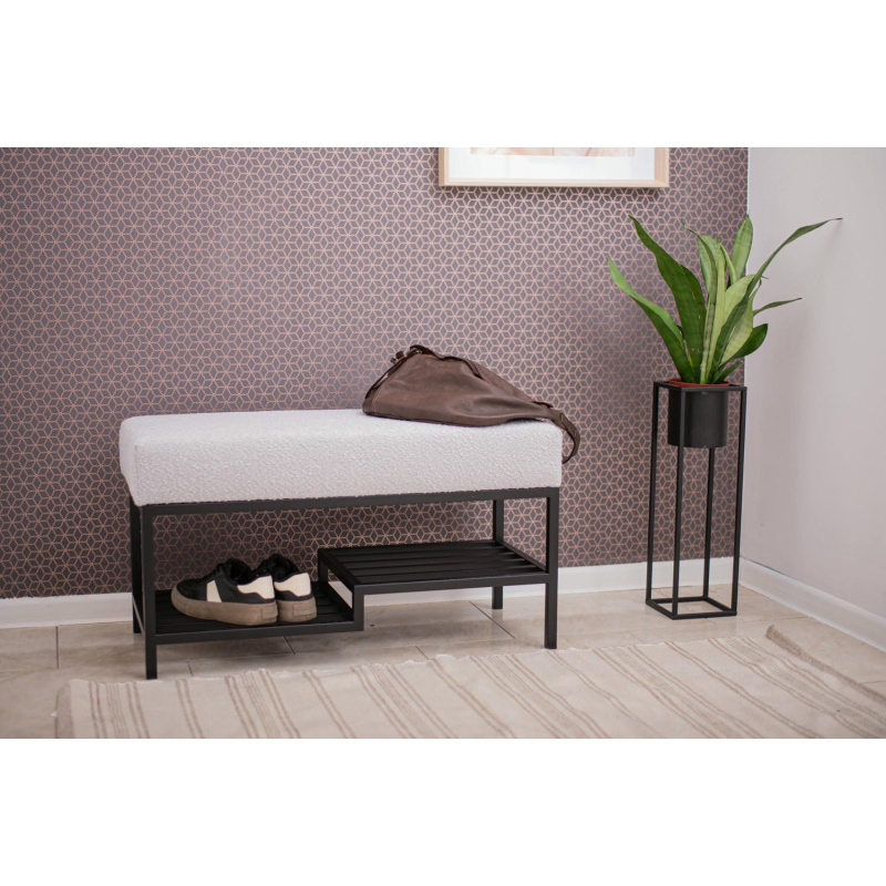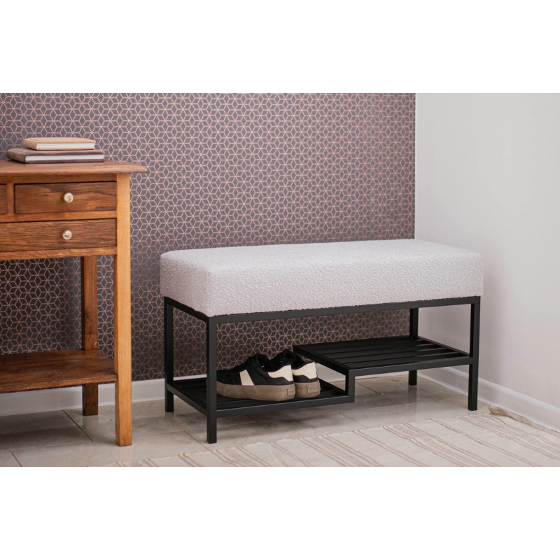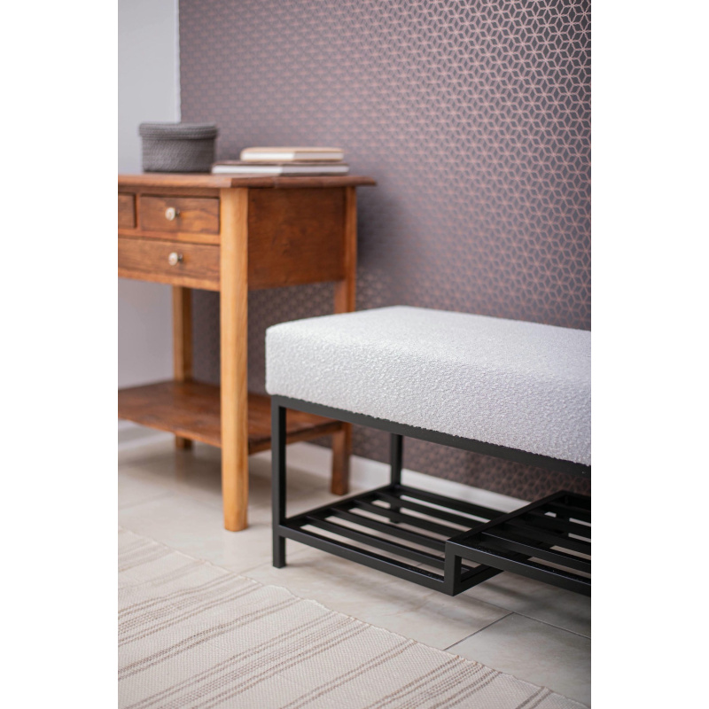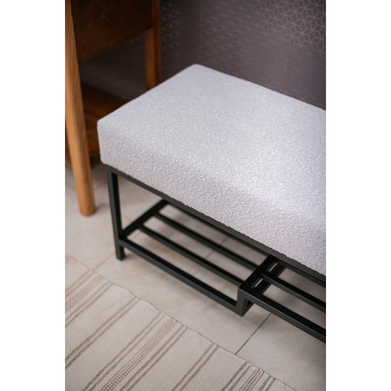 Ławka do przedpokoju 100 cm Baloo 2085 – styl loft, czarna podstawa, jasnoszara tkanina boucle, półka na buty. Wygodne siedzisko, solidna konstrukcja.