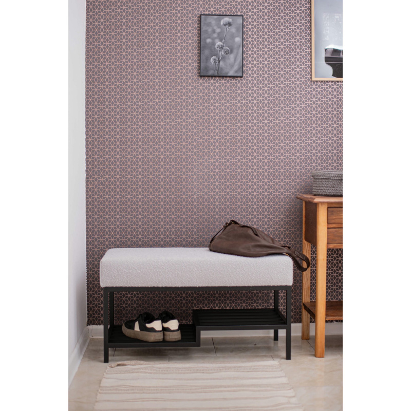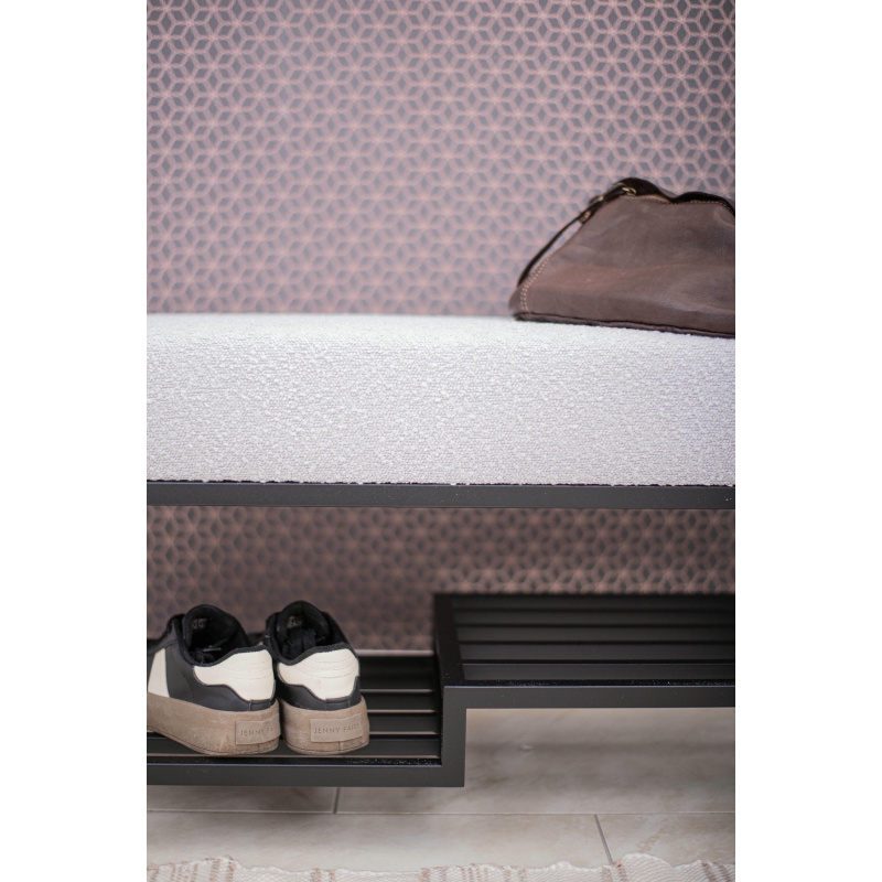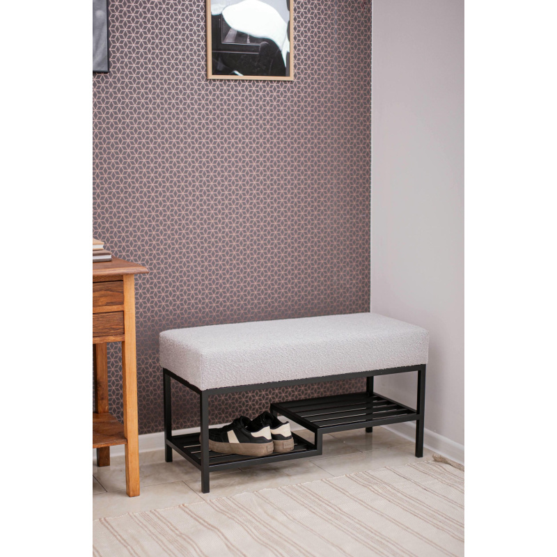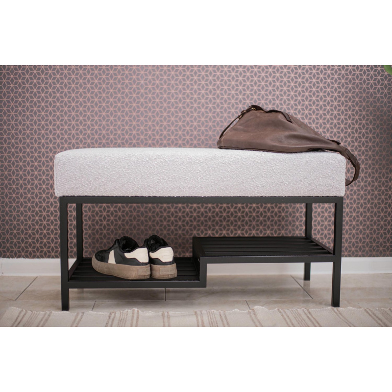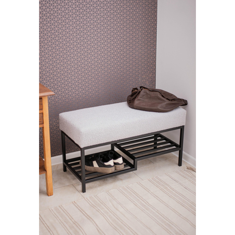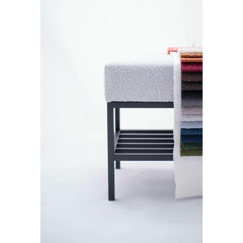 Ławka do przedpokoju 100 cm Baloo 2085 – styl loft, czarna podstawa, jasnoszara tkanina boucle, półka na buty. Wygodne siedzisko, solidna konstrukcja.