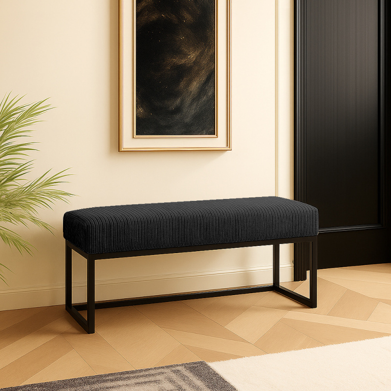 Czarna ławka tapicerowana Bassic-S w wersji black on black to esencja minimalizmu, elegancji i trwałości. Tapicerka z miękkiego sztruksu w kolorze głębokiej czerni (Poso 135) w połączeniu z czarnym, metalowym stelażem tworzy nowoczesny i uniwersalny mebel pasujący do każdego wnętrza.
