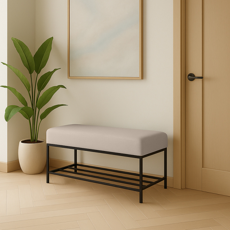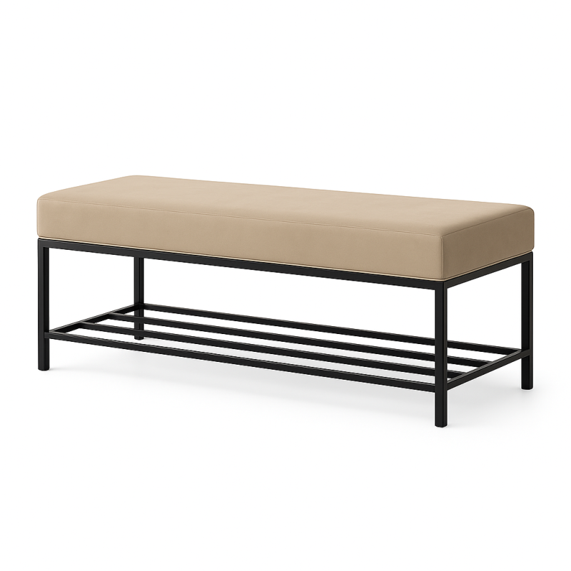Ławka NEW to idealny mebel do przedpokoju, sypialni czy garderoby. Jej minimalistyczny design, beżowa tapicerka i solidna metalowa konstrukcja tworzą harmonijną całość, która podkreśla styl wnętrza.