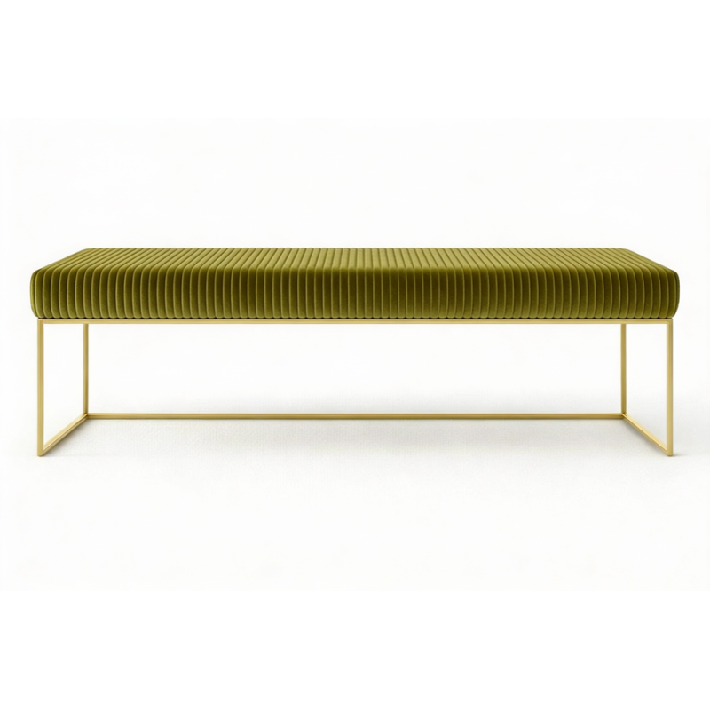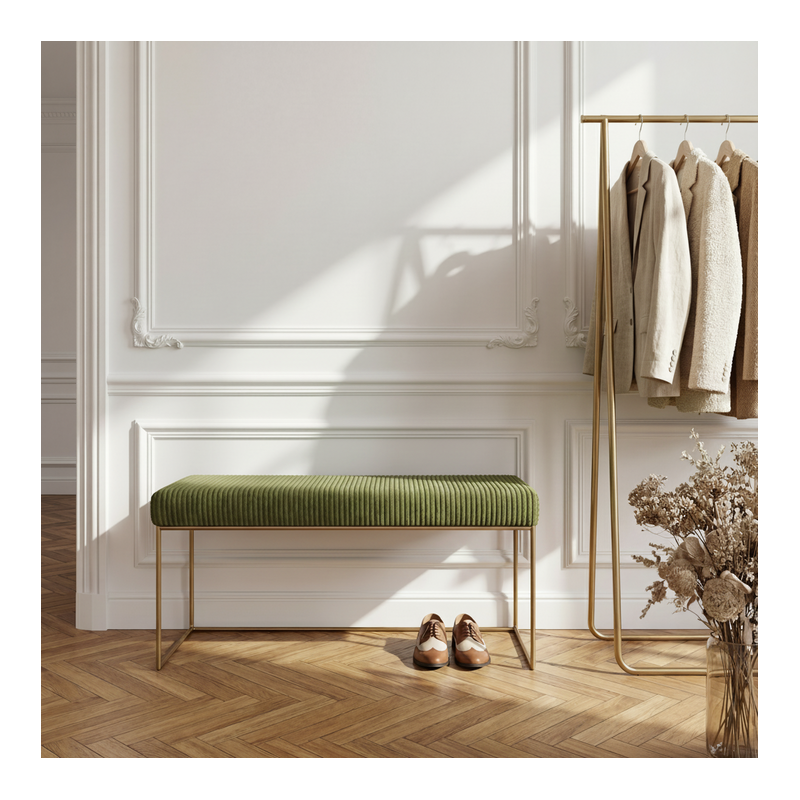 Pufa ławka Style-S 80 cm w oliwkowej zieleni POSO 46 ze złotym stelażem. Eleganckie, tapicerowane siedzisko do przedpokoju, salonu lub sypialni.