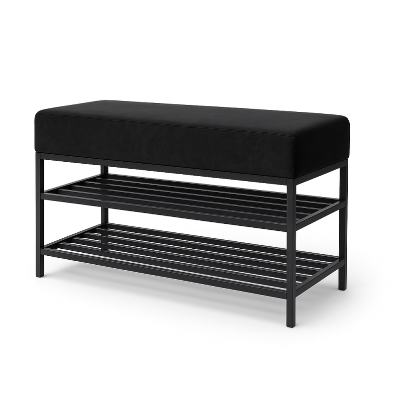 Ławka VIP 80 cm w czarnym welurze Matt Velvet 99 z 2 półkami na buty. Elegancka i funkcjonalna, idealna do przedpokoju, garderoby lub sypialni.