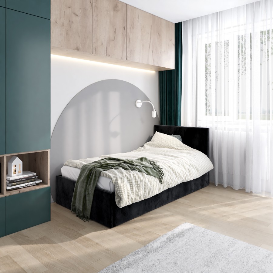 Łóżko Clasik czarne pod materac 80x200, zagłowie gładkie. Łóżko posiada Pojemnik na poście. Wykończone materiał typu welur/velvet, cieniujący. Opcjonalnie: pojemnik metalowy, materac piankowy 11cm, materac kieszeniowy 18cm.