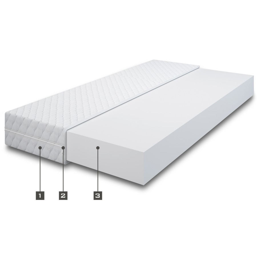 1. Piankowy 11cm (średnio-twardy) H3-H3. Z wkładem wykonanym z pianki T25-10cm. Mimo że jest to tylko pianka jej gęstość (T25) sprawa że materac jest komfortowy.  Nawet pod ciężarem przeciętnej dorosłej osoby materac nie zapadnie się znacząco.