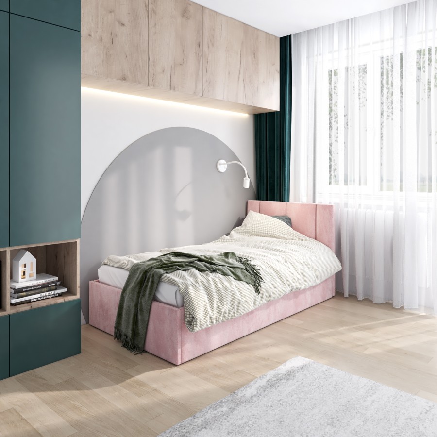 Łóżko pojedyńcze 80x200 różowe Tapicerowane z Zagłowiem. Łóżko posiada Pojemnik na pościel. Wykończone materiał typu welur/velvet, cieniujący. Opcjonalnie: materac piankowy 11cm, materac kieszeniowy 18cm.