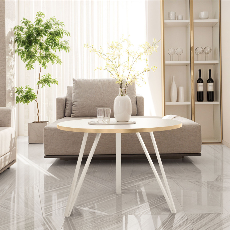 Biały Okrągły Stolik Kawowy z Białym Blatem i Złotym Obrzeżem – Luksus i Styl