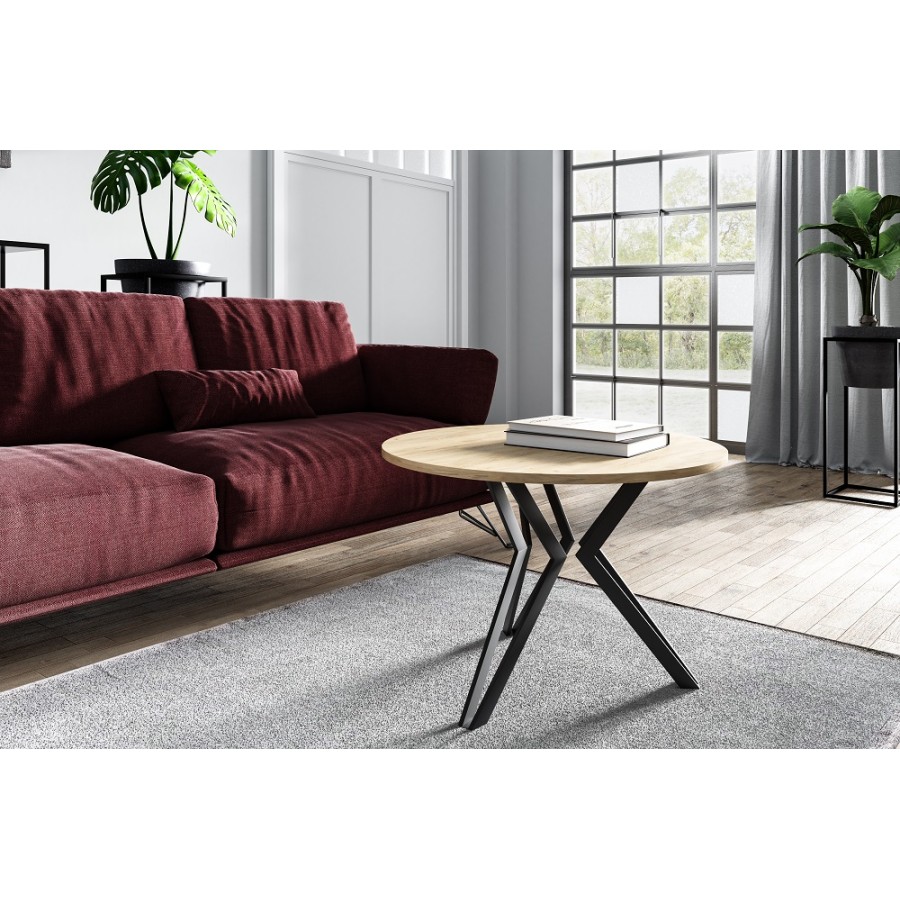 Mos stolik kawowy, okrągły blat średnica 75cm w kolorze dąb Craft, Stelaż Stalowy malowany proszkowo na kolor czarny mat. Mały minimalistyczny.