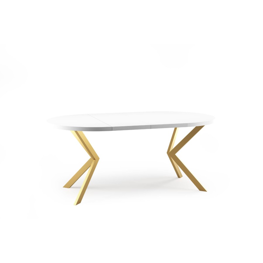 Stół Reda Gold 100 to okrągły, rozkładany stół o średnicy 100 cm (po rozłożeniu 176 cm) w stylu industrialnym z eleganckim, śnieżnobiałym blatem i złotą podstawą. Wykonany z solidnej stali i laminowanej płyty, zapewnia stabilność i trwałość. Idealny do codziennych posiłków i wyjątkowych okazji.