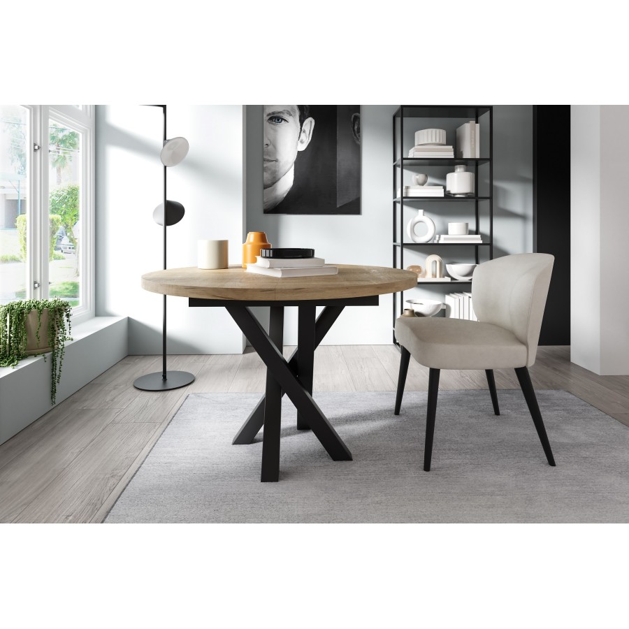 GIWE Okrągły stół rozkładany. Stół do jadalni. Stół do Salonu. Wymiary standard średnica ⌀ 100cm., wysokość 76 cm. po rozłożeniu szerokość blatu wynosi maxymalnie 138 cm. Wybarwienie: blat: dąb Craft; stal - czarny mat.