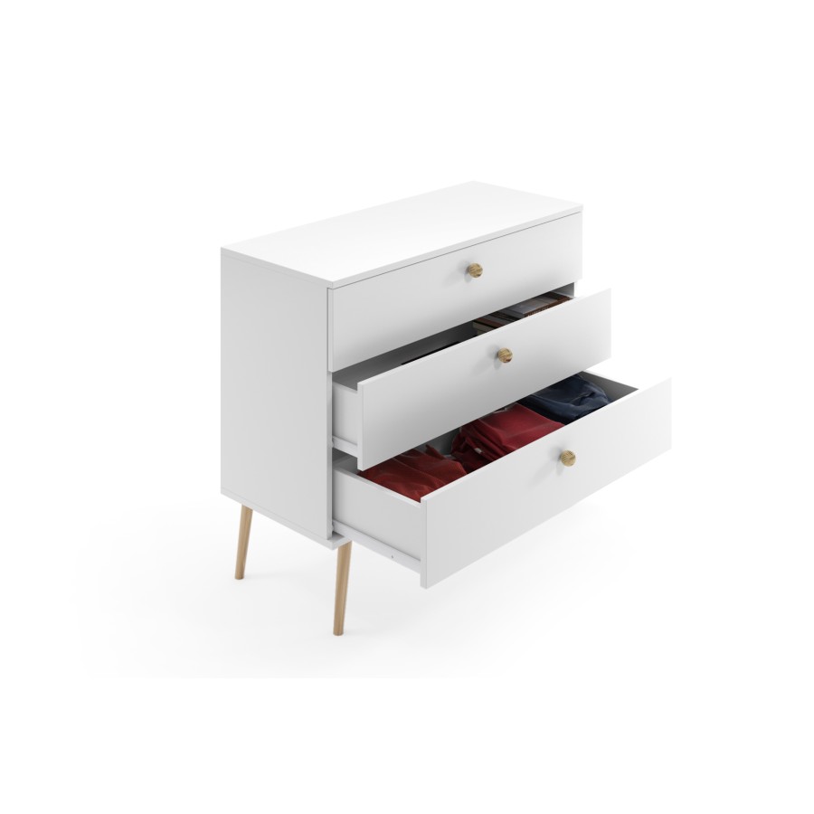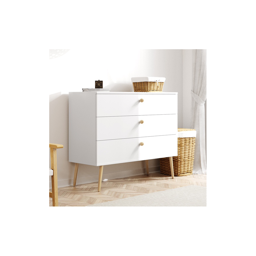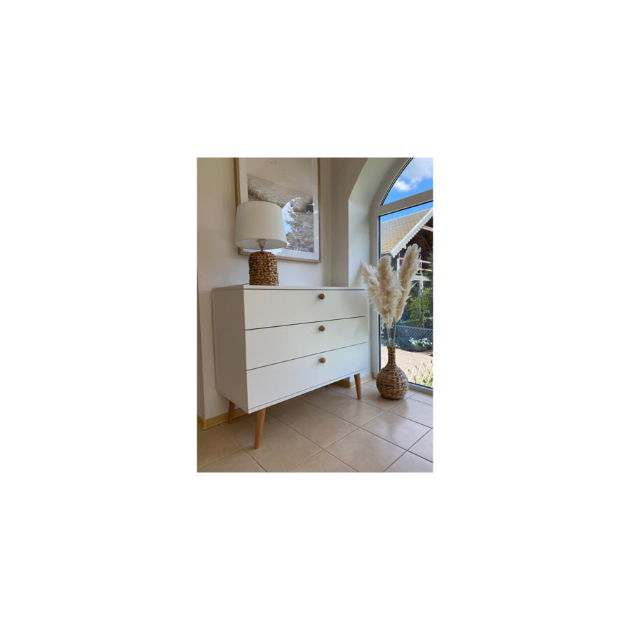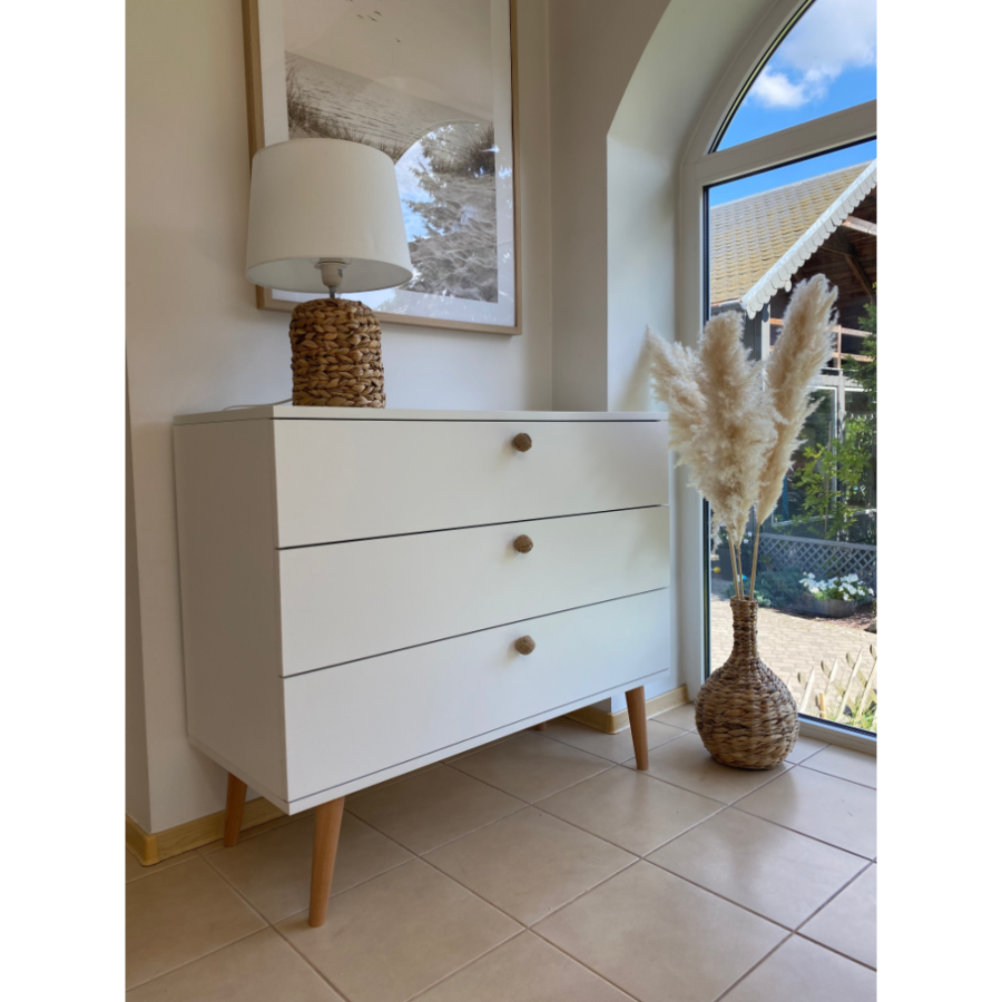 Biała komoda z szufladami w stylu skandynawskim i boho. Solidna konstrukcja, matowa powierzchnia i drewniane nogi. Idealna do przechowywania w sypialni, salonie lub przedpokoju.