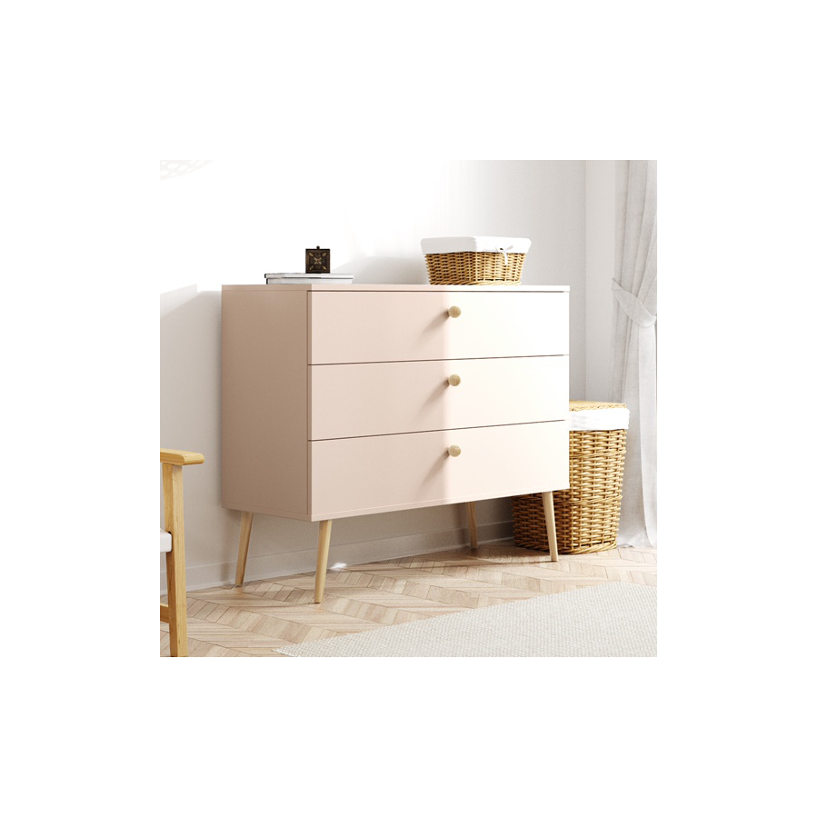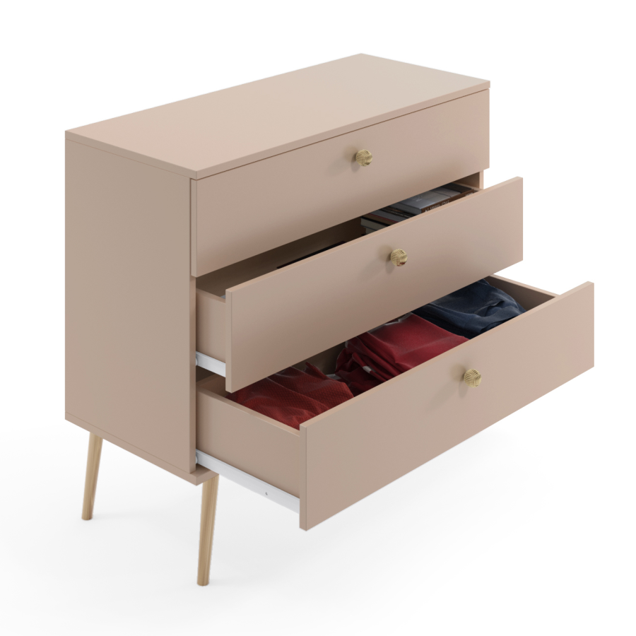 Komoda w pastelowym odcieniu macchiato, idealna do wnętrz w stylu skandynawskim. Drewniane nogi, pojemne szuflady i subtelny design wprowadzają harmonię i funkcjonalność do Twojego domu.