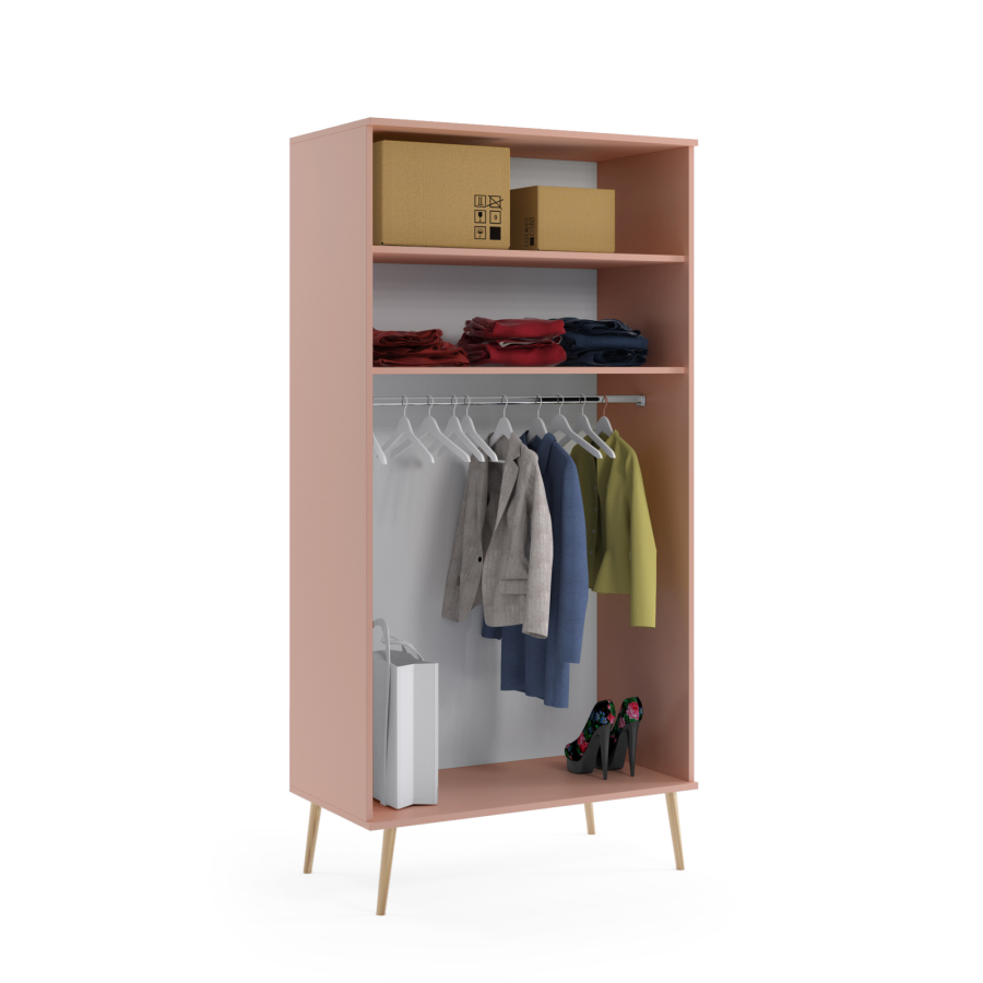 Róż Naturalna Szafa Boho łączy elegancję i funkcjonalność. Z 2 półkami, drążkiem na ubrania i drewnianymi nogami wnosi ciepło i styl do wnętrza. Możliwość dokupienia dodatkowych półek!