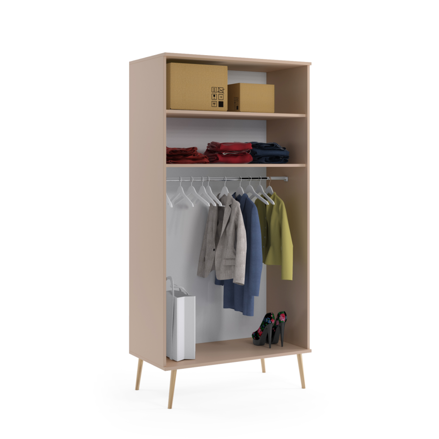 Pastelowa Szafa w Stylu Boho z drewnianymi nóżkami, 2 półkami i drążkiem. Funkcjonalna, stylowa i trwała, idealna do przechowywania. Możliwość dokupienia dodatkowych półek.