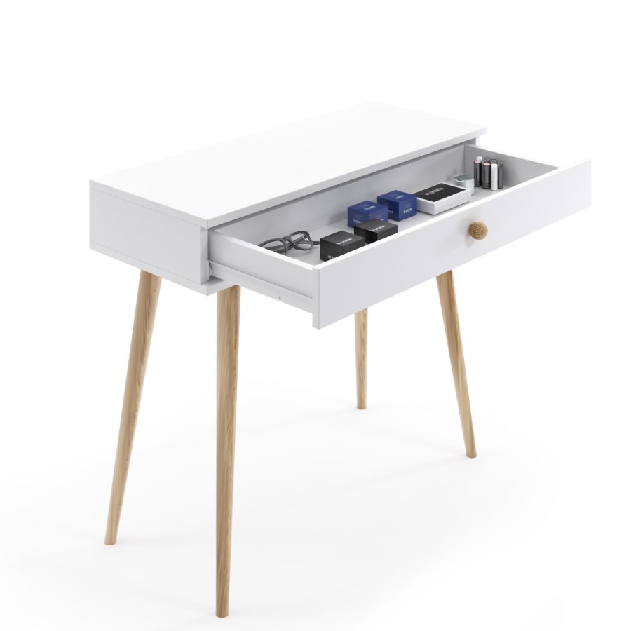 Kompaktowa biała konsola toaletka w stylu skandynawskim. Elegancki design, matowe wykończenie i wszechstronność sprawiają, że pasuje do sypialni, przedpokoju lub łazienki.