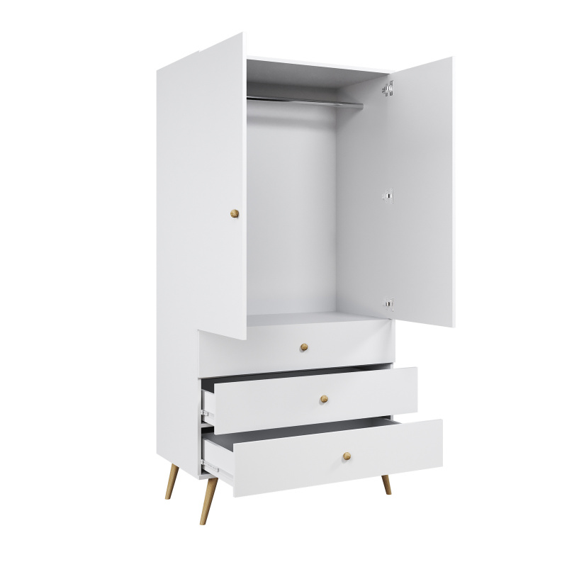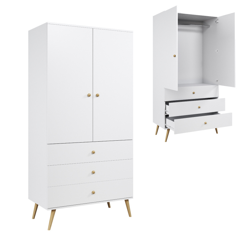 Biała szafa 100 cm w stylu skandynawskim z trzema szufladami, półką i drążkiem. Elegancka, praktyczna i solidna – idealna do sypialni, garderoby lub przedpokoju.