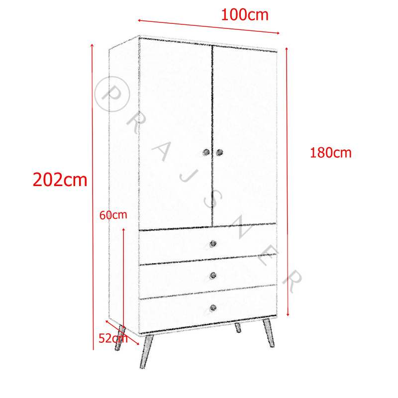 - Przemyślana konstrukcja: Trzy pojemne szuflady, szeroka półka oraz drążek na wieszaki umożliwiają wygodną organizację ubrań, akcesoriów i innych przedmiotów.