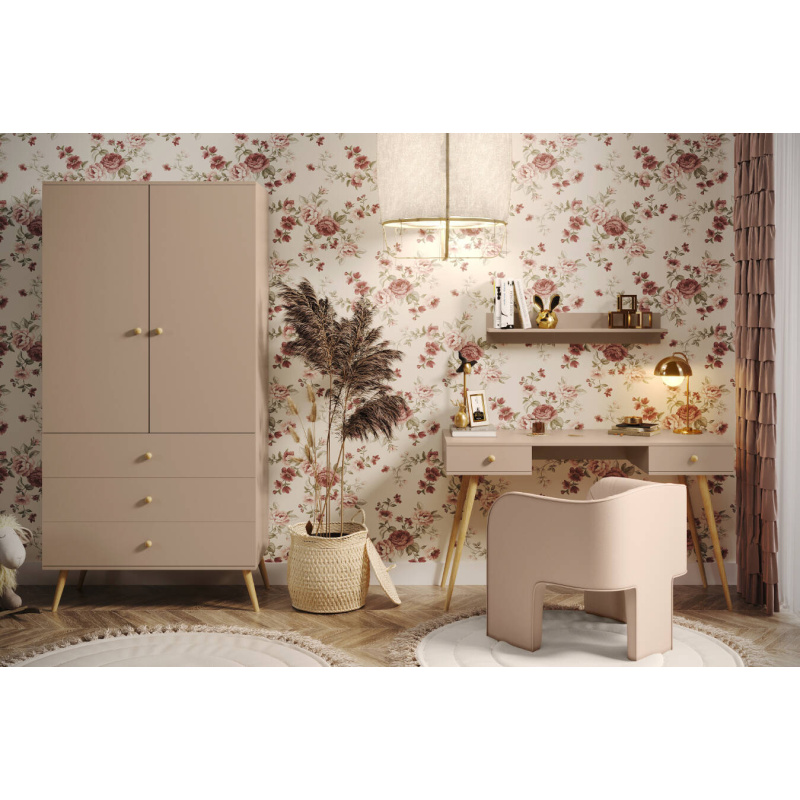 Pastelowa Szafa 100 cm łączy styl skandynawski i boho z funkcjonalnością. 3 szuflady, półka i drążek zapewniają porządek, a pastelowy odcień i drewniane nóżki dodają elegancji wnętrzu.