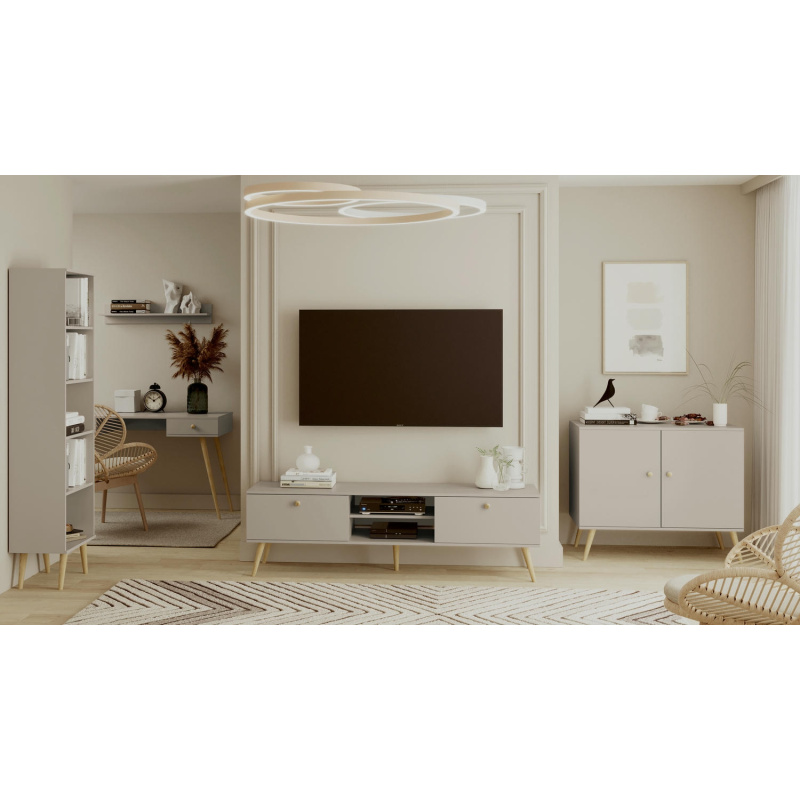 Stylowa komoda w kolorze kaszmir z drewnianymi nogami. Połączenie skandynawskiego minimalizmu i boho. Funkcjonalna, elegancka i idealna do każdego wnętrza.