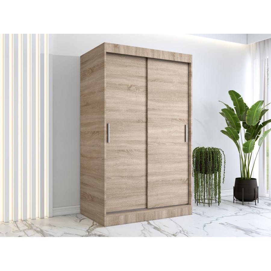 Szafa przesuwna 120x200cm w kolorze dąb sonoma z półkami i drążkiem, zgrabna szafa idealna do przedpokoju, pokoju młodzieżowego lub małego salonu.