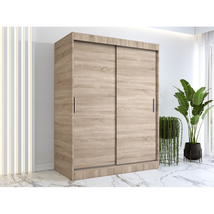 Szafa przesuwna 150x200cm w kolorze dąb sonoma z półkami i drążkiem, zgrabna szafa idealna do przedpokoju, pokoju młodzieżowego lub małego salonu.