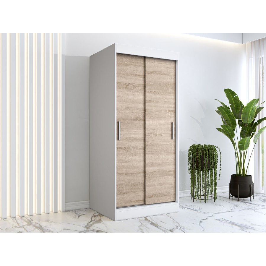 Szafa przesuwna biała 90x200cm z białym korpusem i frontamu dąb sonoma, zgrabna szafa idealna do przedpokoju, pokoju młodzieżowego lub małego salonu.