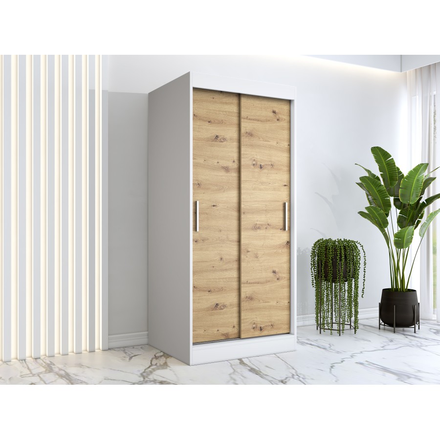 Szafa przesuwna 90x200cm z białym korpusem i frontami dąb artisan, szafa do przedpokoju, pokoju młodzieżowego lub małego salonu.