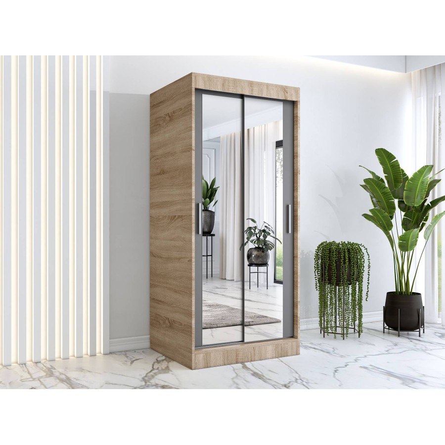 Szafa Przesuwnaz lustrami 90x200cm Korpus Dąb Sonoma, Front Antracyt, idealna do przedpokoju, pokoju młodzieżowego lub małego salonu.